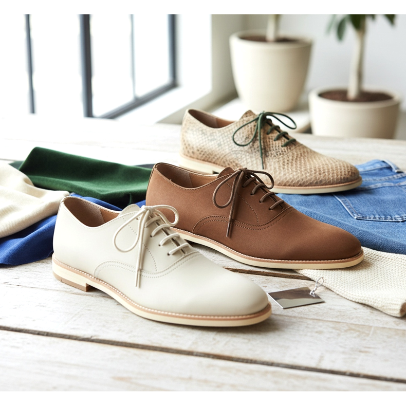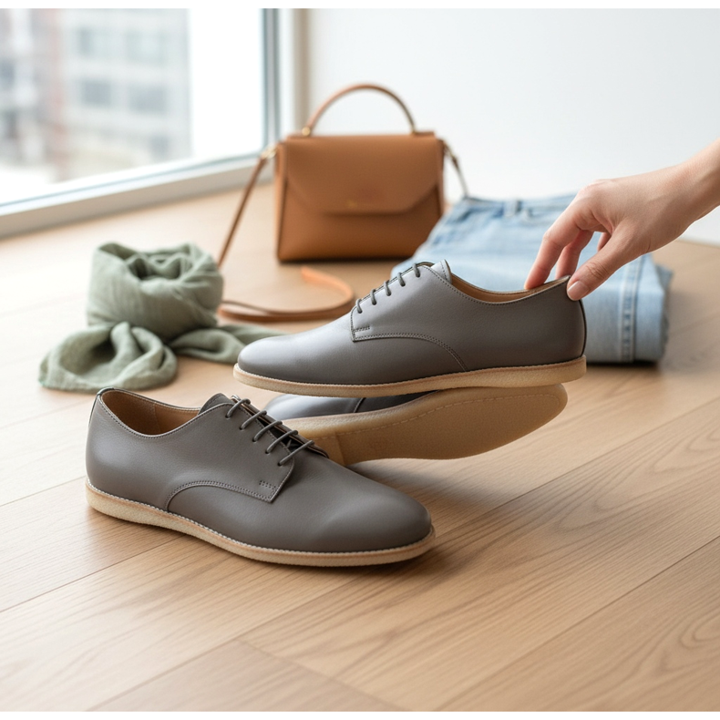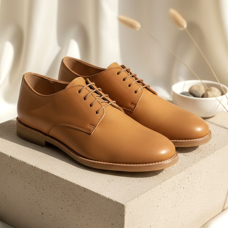 Det viktigaste med soft-derby är materialet: mjukt kalvskinn eller nubuck av högsta kvalitet. Billigare versioner använder eko-snake läder eller mjuka mönstrade tyger. Skorna har ingen stel struktur – de är flexibla och anpassar sig efter fotens form från första användningen.