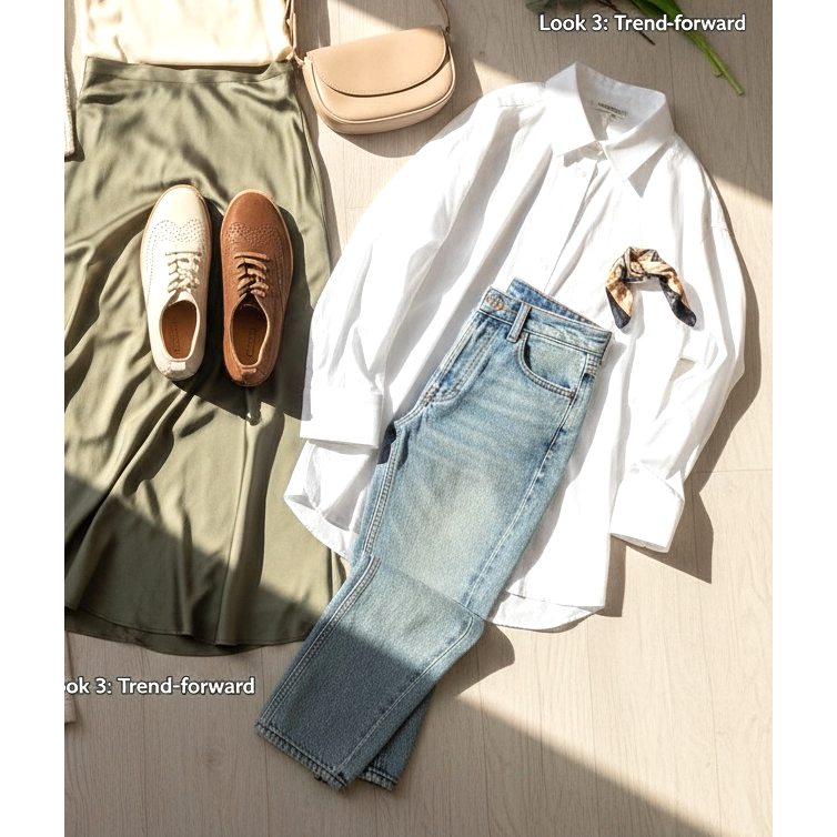 Look 3 - Trend-framåt: Krämmjukt derby + vintagejeans (något blekta, runt midjan) + oversized vit skjorta instoppad i byxorna. Parisisk effekt, opretentiös, elegant.