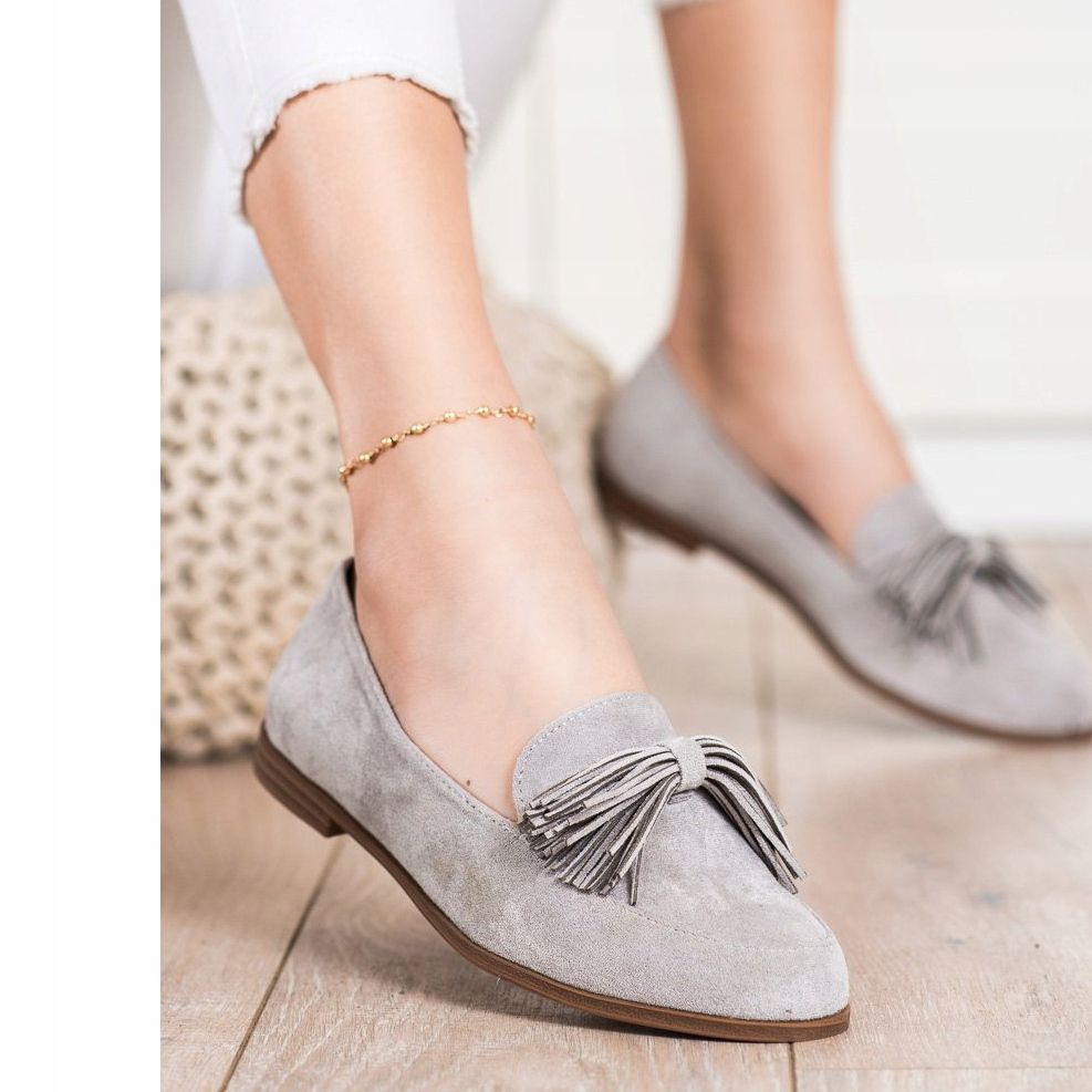 Fransarna är en viktig detalj som tillför originalitet till dessa skor, och den runda tån främjar komfort utan att begränsa tårna. Deras universella grå färg gör dem lätta att kombinera med andra klädesplagg, och den platta hälen (1,5 cm hög) gör dem lämpliga för vardagsbruk såväl som för mer formella tillfällen.