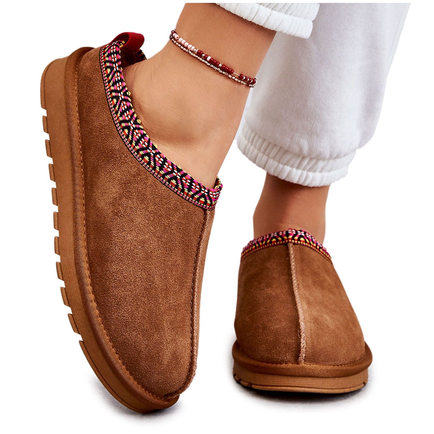 Elegant, slip -in papcie camel buffie av hög kvalitet naturligt mocka läder. Den mjuka, tjocka pälsen inuti ger trevlig uppvärmning även på kalla dagar, och den massiva plattformen (höjd 3 cm) och den icke -slipande sula garantistabiliteten och komforten när man går runt i huset.