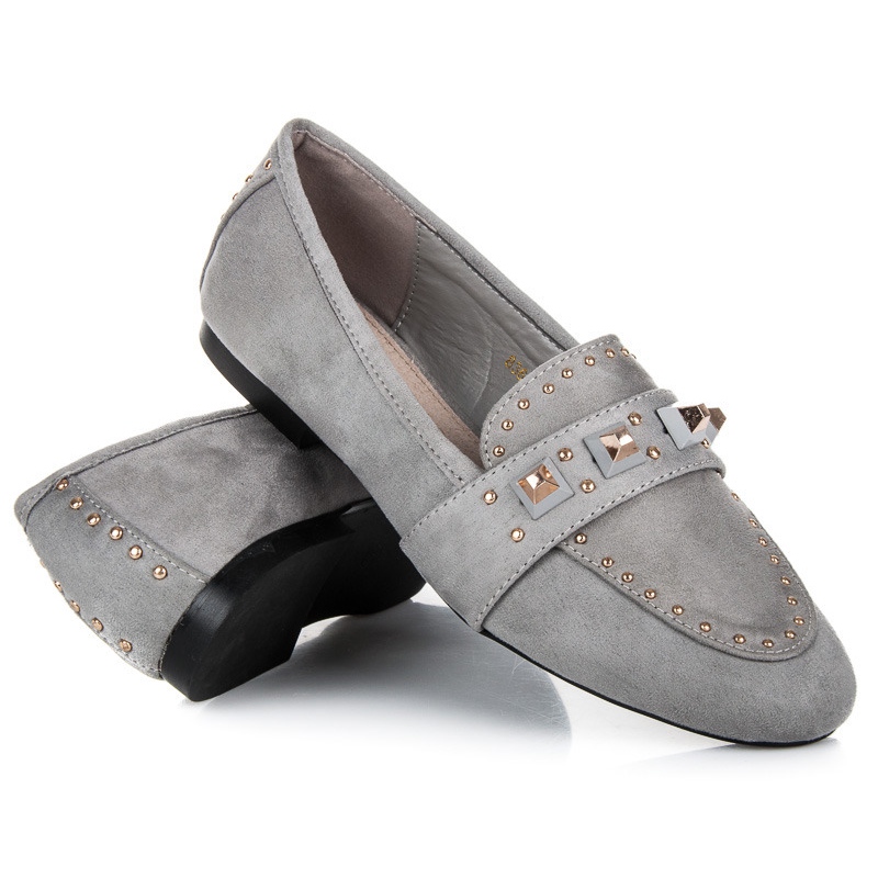Plattformens höjd är 1,5 cm, och sulan av plast med slitbana ger bra grepp vilket gör mockasinerna perfekta för vår och sommar. Tack vare den universella grå färgen kan du enkelt matcha dem till många stilar - för jobbet, skolan, utekvällar eller promenader.