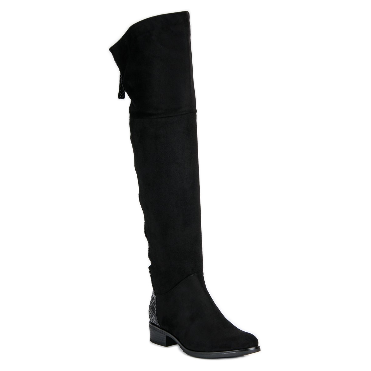 Tillverkade av ekologisk mocka, lockar stövlarna uppmärksamhet inte bara med sitt raffinerade utseende, utan också med sin praktiska finish - ormskinn ger dem en unik karaktär. Den höga ovandelen, som når över knät, formar figuren perfekt, och den platta hälen säkerställer komfort även under hela natten.