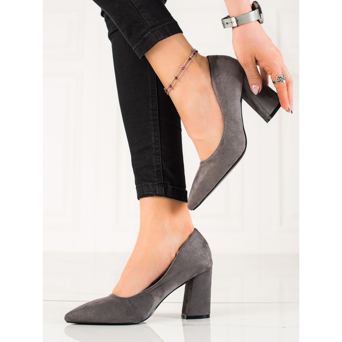 Den 8 cm höga klacken är den perfekta kombinationen av elegans och komfort, vilket gör att du kan spendera långa timmar i dem utan att oroa dig för obehag. De runda tårna lägger till subtilitet och unik stil till skorna, och deras universella grå färg gör att de matchar perfekt med en mängd olika outfits.