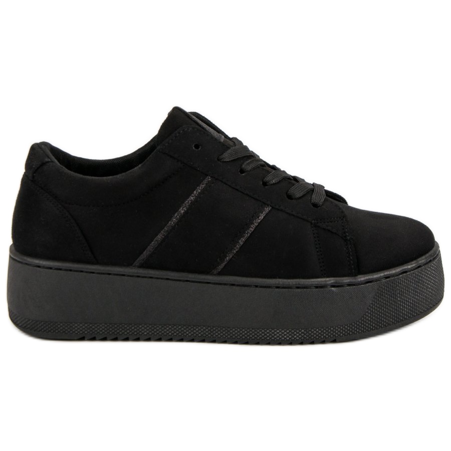 Vi presenterar svarta sportskor i mocka, som har blivit ett måste i varje kvinnas garderob. Dessa snygga sneakers är gjorda av högkvalitativ fuskmocka och kombinerar elegans med funktionalitet. Deras imponerande höga plattform på 4,5 cm ger inte bara karaktär, utan säkerställer också komfort när den bärs.