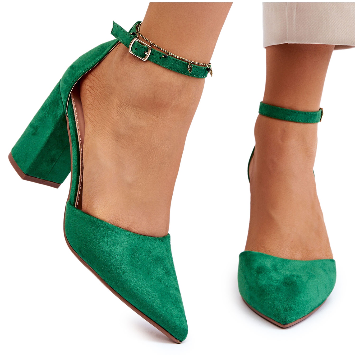Upptäck elegansen och komforten hos PS1 Lexie mocka högklackade pumps i en vacker grön färg. Dessa klassiska skor, gjorda av högkvalitativ ekomocka, kommer definitivt att berika din garderob. Spetsiga tår ger dem en chic look, och en justerbar rem som fästs runt ankeln säkerställer perfekt passform och stöd.