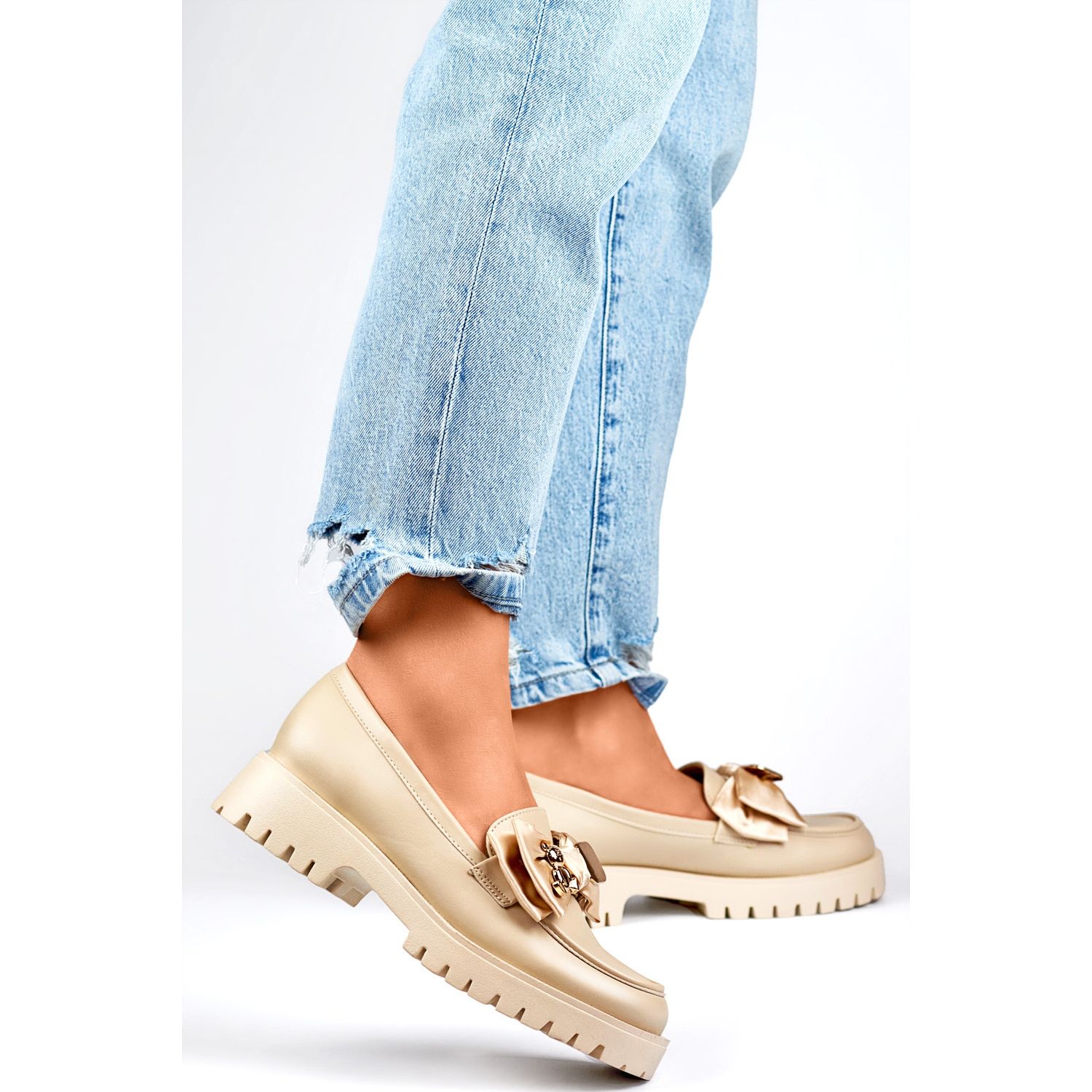 Mockasins beige färg gör dem extremt mångsidiga och enkla att matcha till en mängd olika garderober. Dessa eleganta loafers med en båge kommer säkert att vara ett bra val under våren och sommaren, men tack vare deras tidlösa design kommer de att arbeta under hela året och lägga till elegans och komfort för alla stilisering.