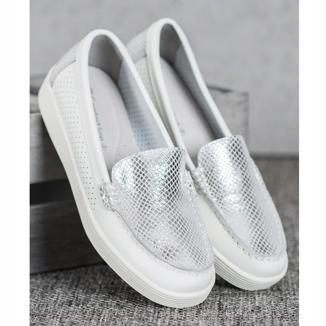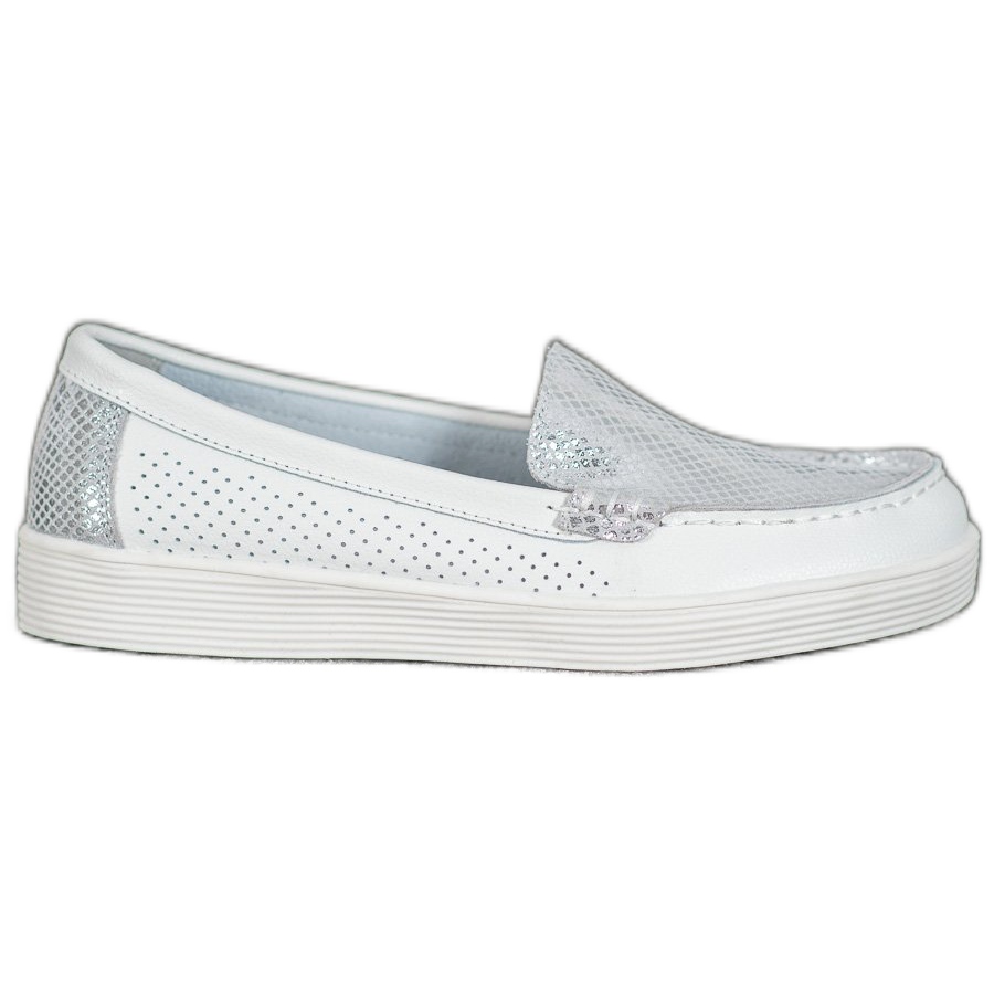 VINCEZA plattformsloafers i vitt och grått är det perfekta valet för kvinnor som värdesätter elegans och komfort. Dessa klassiska, ömtåliga skor är gjorda av högkvalitativt naturligt läder, vilket säkerställer hållbarhet och en stilren look. En intressant accent är silverdetaljen placerad på toppen av skon, vilket ger dem en modern karaktär.