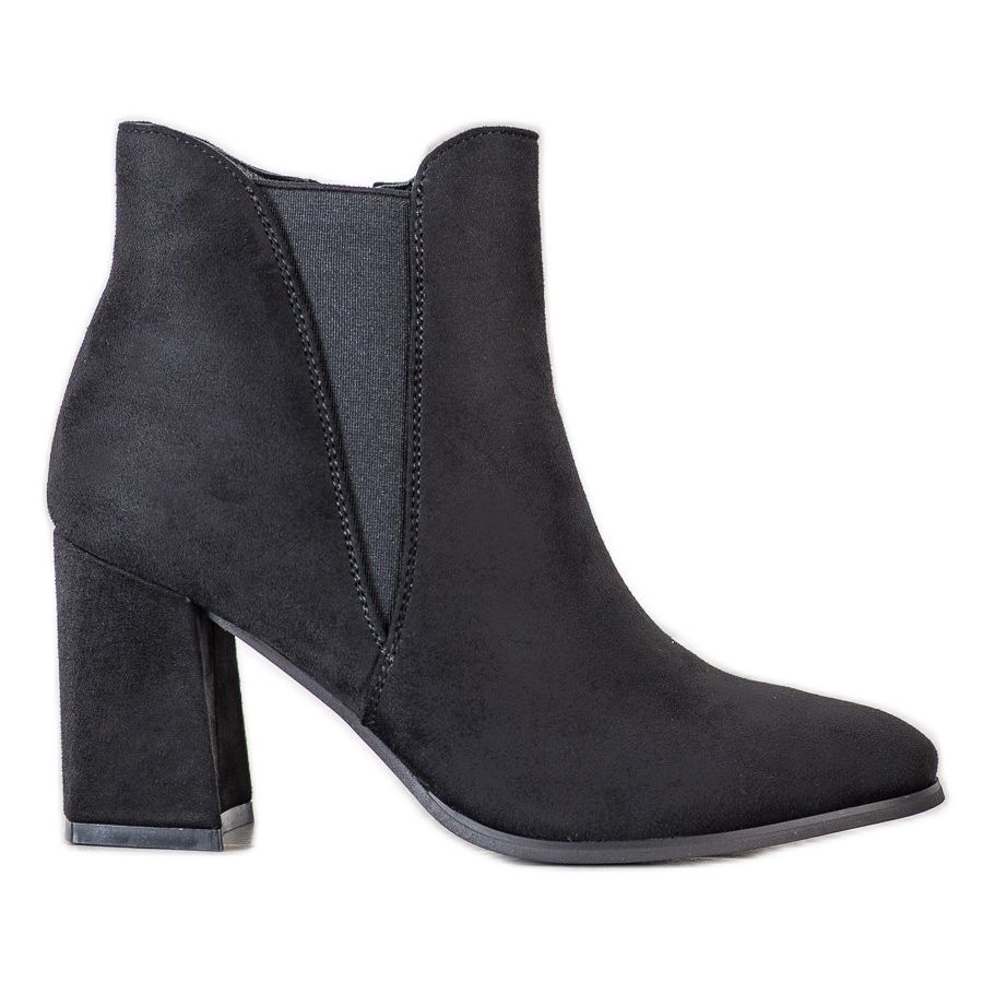 Stövlarna är gjorda av högkvalitativt ekologiskt mockaläder, vilket ger dem ett lyxigt utseende och är ett nöje att använda. Deras personliga stil framhävs av den eleganta häldisken, som är stängd och förstyvad, vilket säkerställer stabilitet och komfort när den bärs. Tack vare den runda tån och fotledshöjden (10-11 cm) kommer du att känna dig bekväm och se chic ut på samma gång.