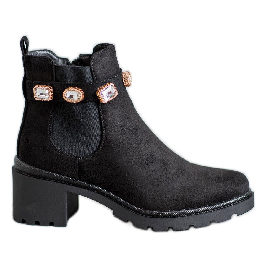 En ytterligare fördel är dekorativa kristaller som ger stövlarna en unik karaktär och väcker uppmärksamhet. Funktionaliteten har förstås inte glömts bort - sulan med slitbana, gjord av syntetiskt material, säkerställer tillräckligt grepp på olika underlag.