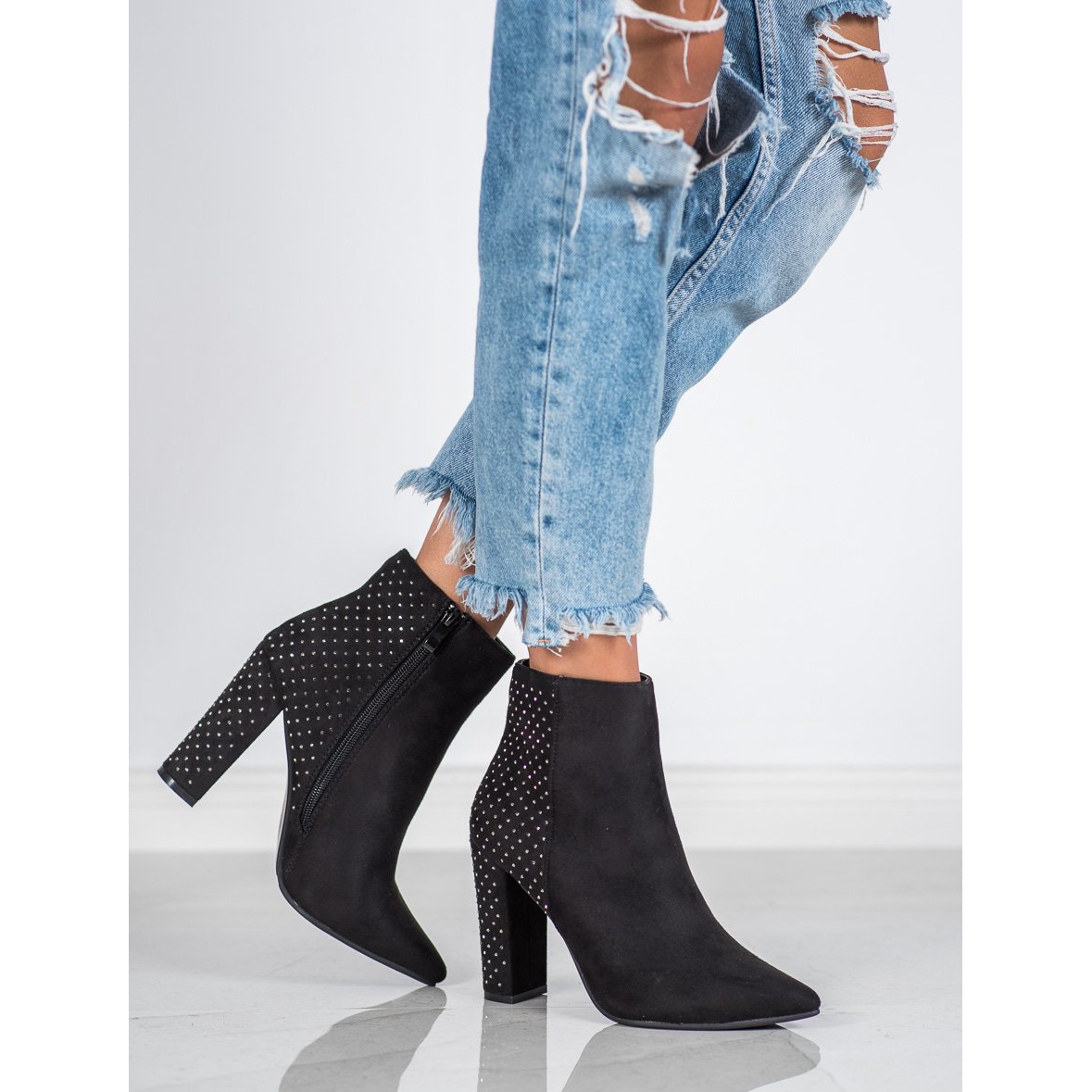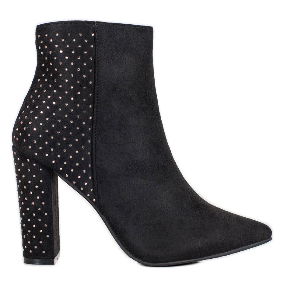 Stövlarna är gjorda av högkvalitativt ekologiskt mockaläder, vilket säkerställer inte bara ett elegant utseende, utan också hållbarhet. Dekorativa strass placerade på baksidan av skorna ger dem en unik glans, vilket gör dem till ett perfekt komplement till både avslappnade och mer eleganta outfits.