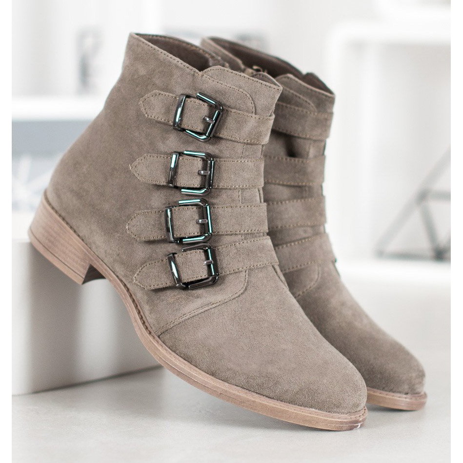 Stövlarna når över vristen, vilket gör dem till ett perfekt komplement till avslappnade stilar. Det finns en dragkedja på sidan av ovandelen som gör den lättare att ta på, och det finns dekorativa metallspännen på framsidan av skorna som ger dem en unik karaktär. Rundade tår och en mjuk, inbyggd häl gör stövlarna extremt bekväma och deras 3 cm hälhöjd säkerställer stabilitet.