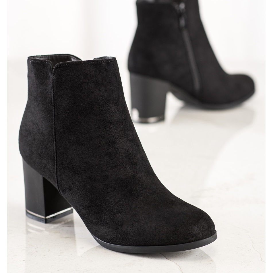 Janessa ankelboots i svart mocka är det perfekta valet för kvinnor som värdesätter komfort kombinerat med elegans. Dessa skor är gjorda av högkvalitativt eko-läder imiterad mocka och har en 7 cm hög matt klack som garanterar stabilitet och komfort att bära. Häldisken är stängd och förstyvad, vilket dessutom ökar komforten och framhäver den klassiska stilen på skorna.