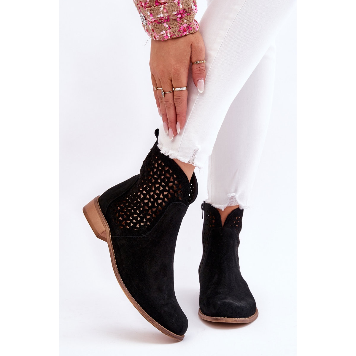 Suede Boots Nicole 2791/028 - Elegant, bekväm och universell, perfekt dagligen och för mer eleganta stilar. Tillverkad av naturlig mocka i en klassisk svart färg, med en lätt öppningsdekoration, vilket ger dem subtil lätthet. Skjutreglaget som är sydd på sidan gör det lättare att ta på sig, och en platt häl (3 cm) säkerställer komfort hela dagen. Det naturliga läderinsatsen ökar komforten och andningsförmågan. Modellen räcker till vristen (övre höjd 14 cm) - ett bra val för byxor, kjolar och klänningar.