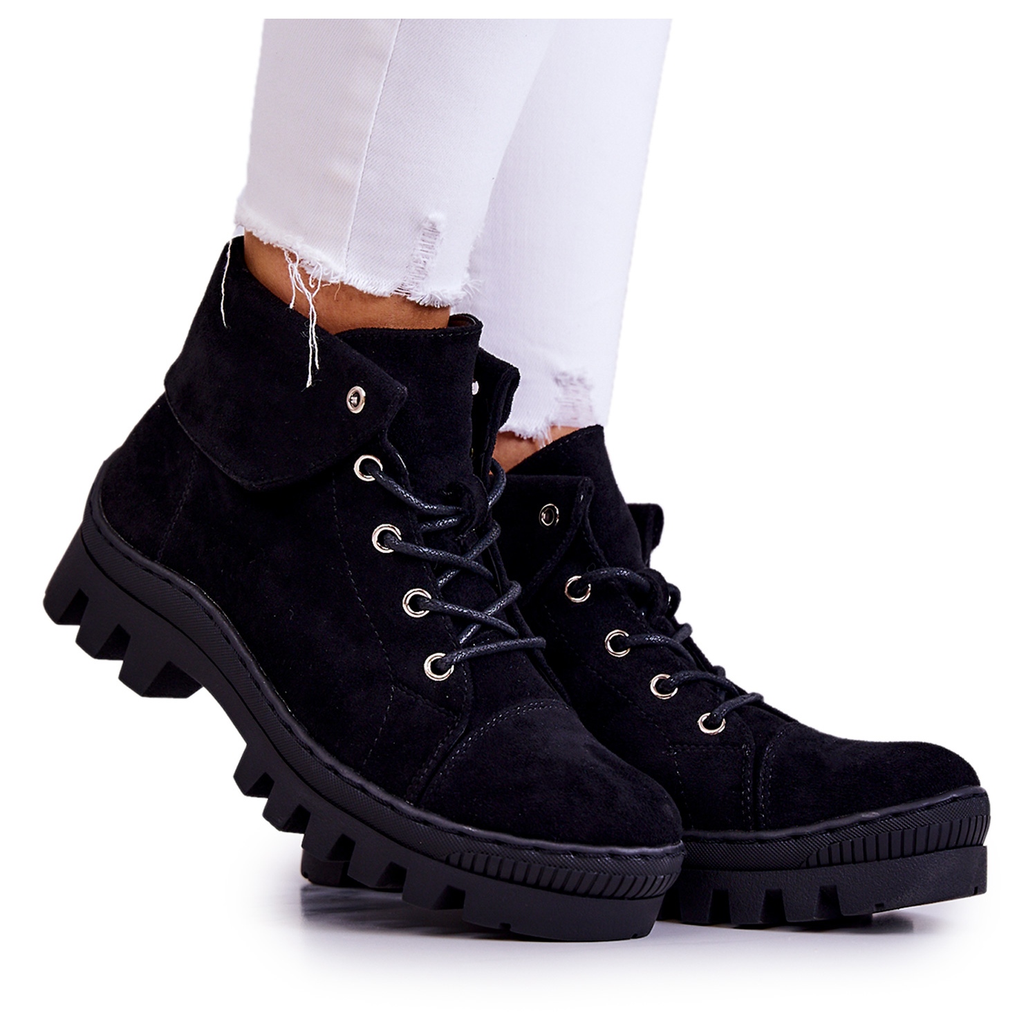 Stövlarna knyts med runda snören, vilket säkerställer en perfekt passform till foten. Dessa stövlar har en tjock sula med fashionabla utskärningar som ger karaktär och garanterar inte bara stil utan också stabilitet. Skons tå är förstyvad och rundad vilket gör den bekväm att ha på sig.