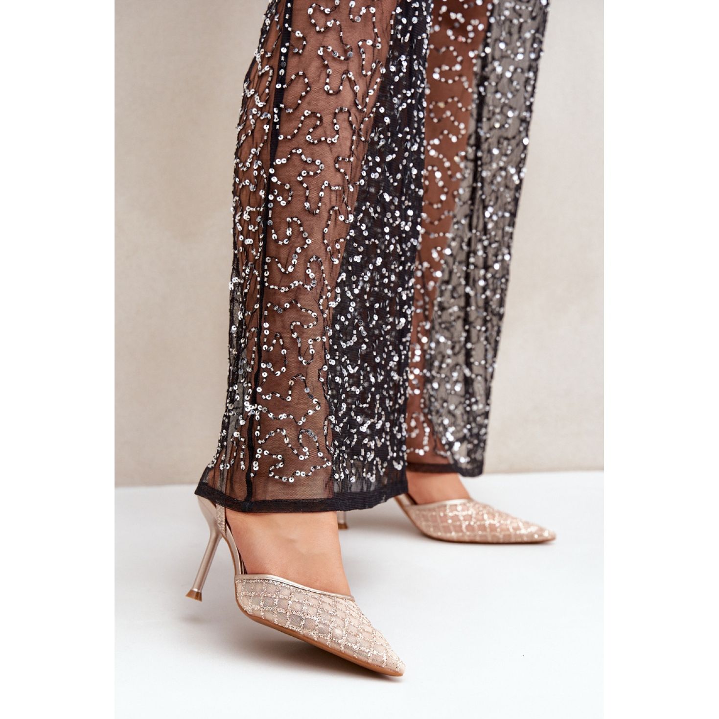High Heels Berilae B1639-202 i en skugga av gyllene brokad är ett förslag för kvinnor som vill lägga till sitt utseende i glansen och stilen. Dessa eleganta skor kännetecknas av spetsiga tår som optiskt förlänger benen, och deras hälhöjd på 8,5 cm garanterar en sensuell effekt. Tillverkad av tyg täckt med glitterpartiklar, reflekterar höga klackar subtilt ljus, vilket gör dem till det perfekta valet för kvällsutflykter, fester eller nyårsafton.