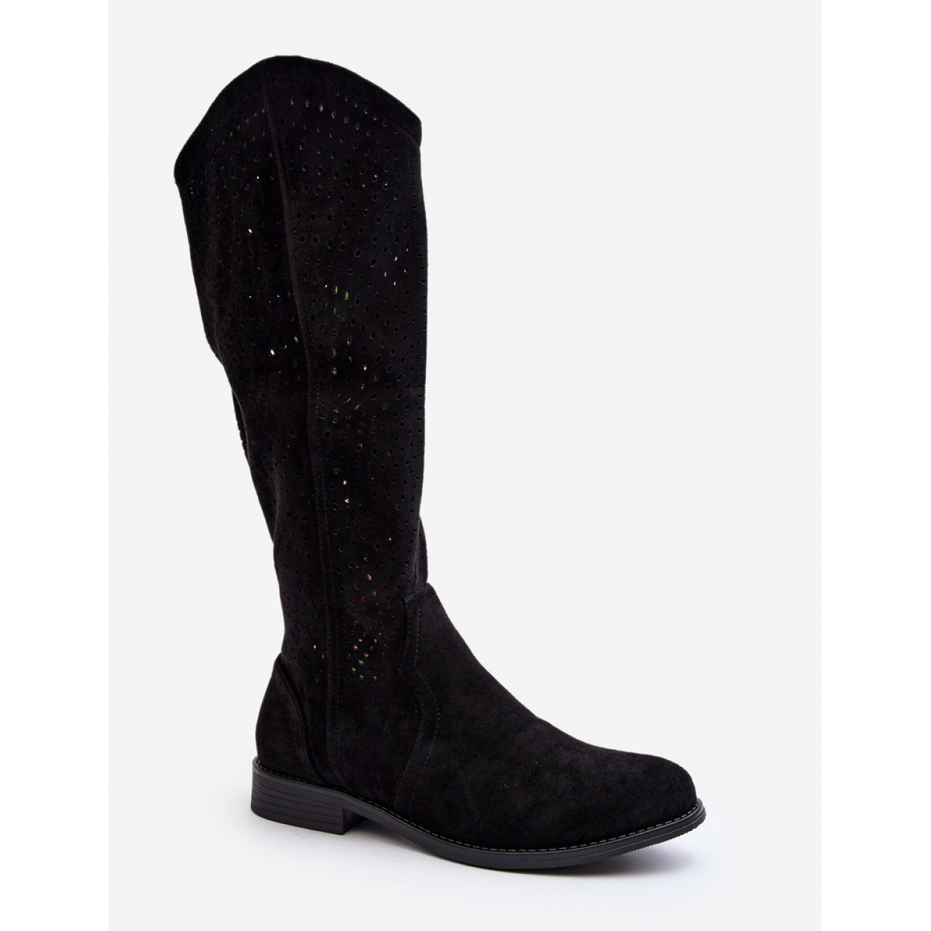 Ställ på en stabil, platt häl med en höjd av 3 cm, säkerställa komfort under dagen. Openwork -överdelen, som når vid knäet, ger dem en unik karaktär och rundade näsor betonar det klassiska snittet av kosackar.