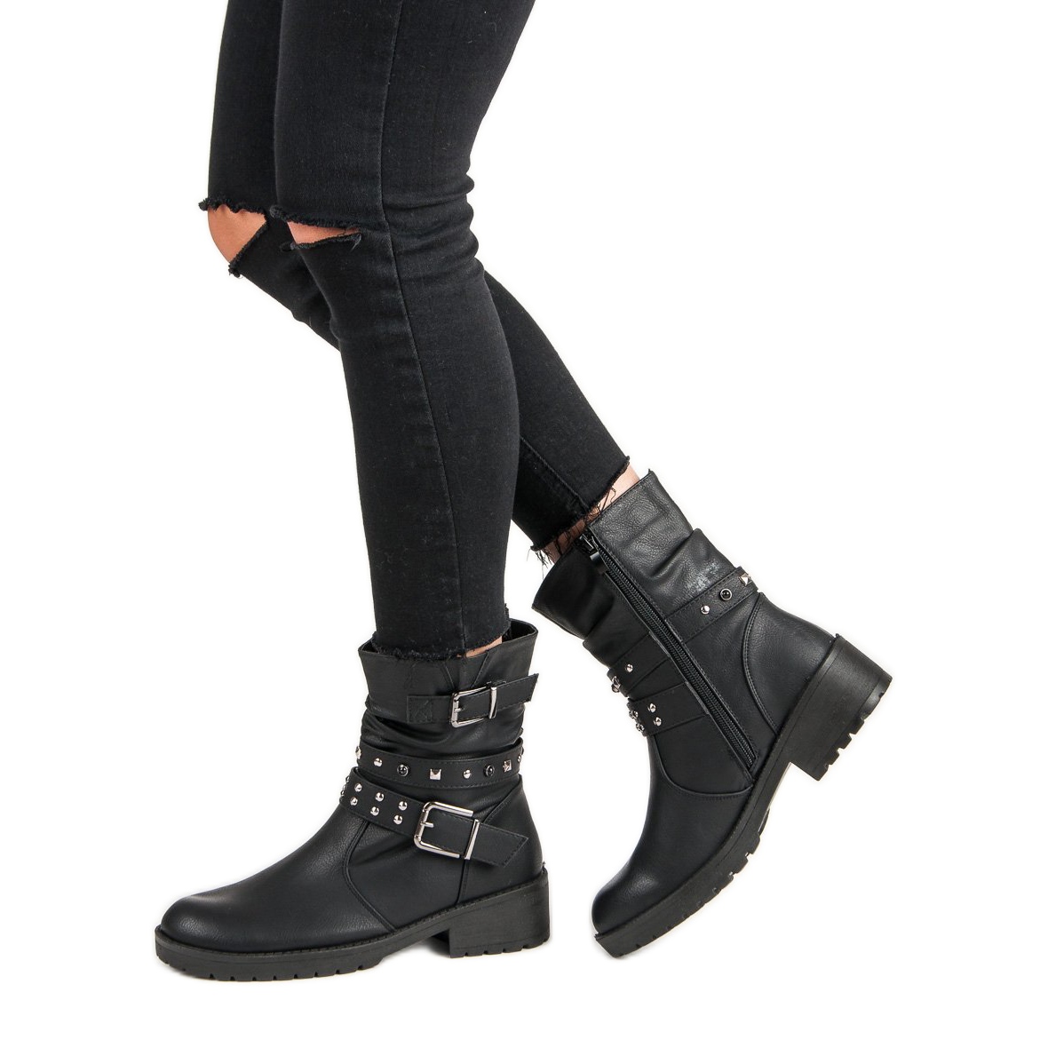 Stövlarna är dekorerade med snygga remmar med strass och dekorativa spännen som sätter karaktär till rocklooken. Knäpps med dragkedja, de är praktiska och lätta att ta på. En platt 4 cm hög klack och en 2 cm hög plattform gör denna modell inte bara estetisk utan också bekväm för vardagsbruk.