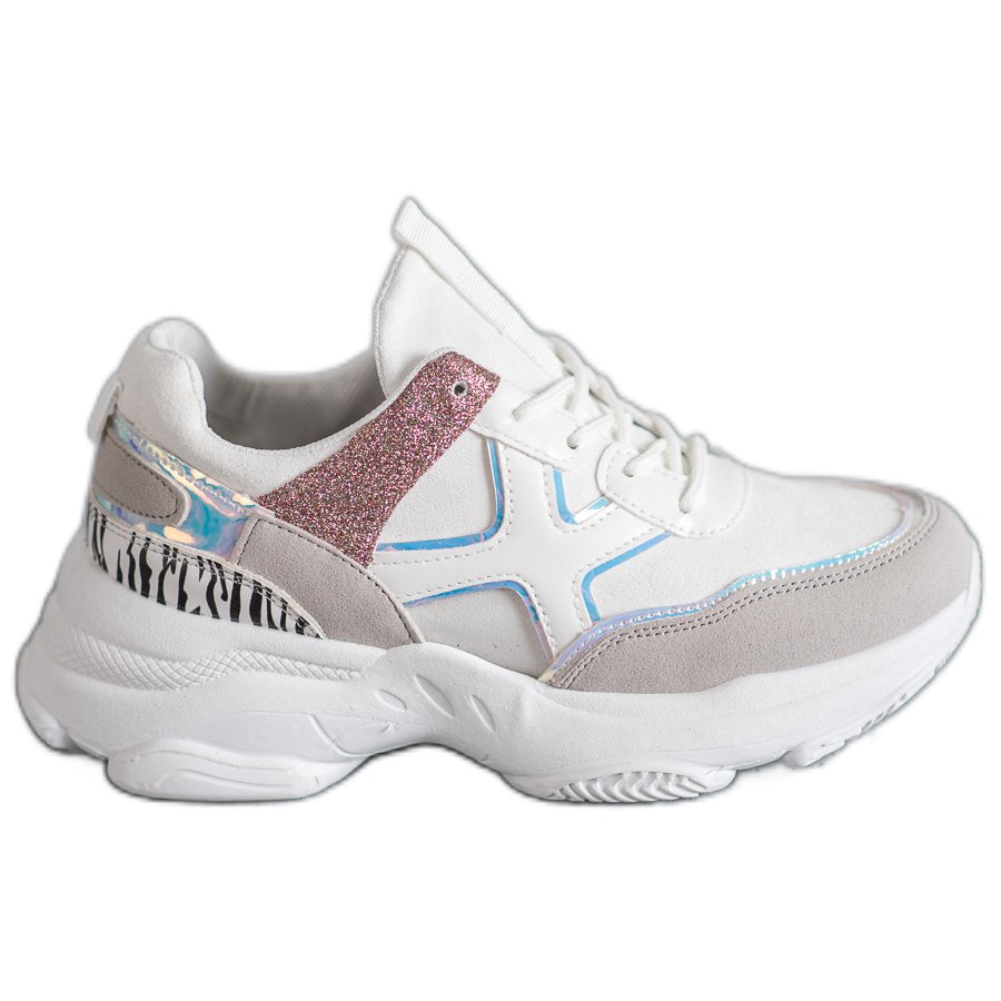 Dessa skor kännetecknas av sin vita färg, vilket gör dem universella och matchar många stilar. Det som dock skiljer dem från andra är iögonfallande gråa inlägg och ursprungliga glitterelement och ett djurmotiv, som ger dem en unik karaktär.