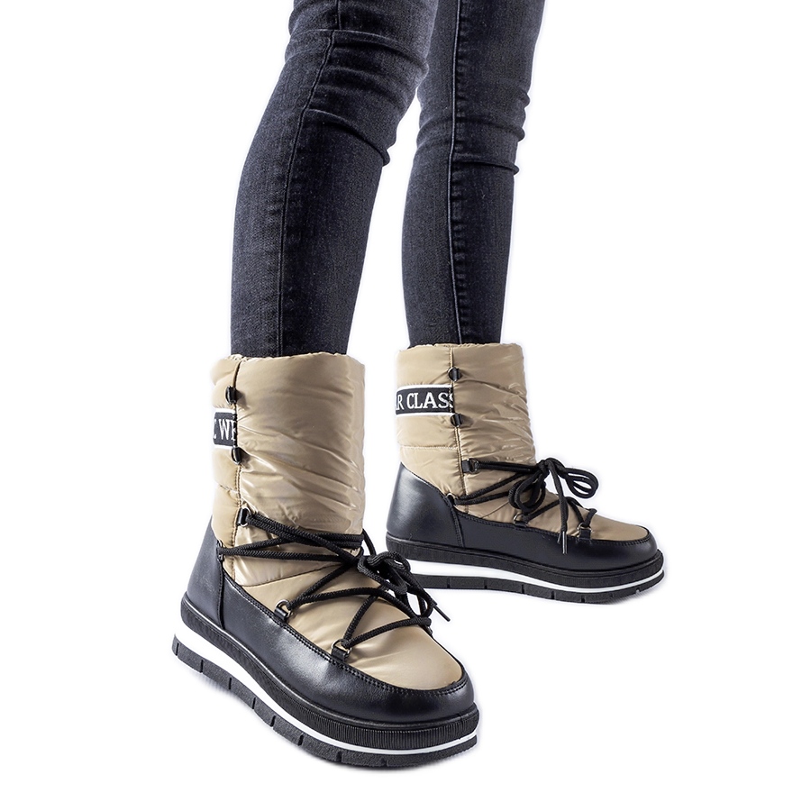 Mörka beige snöstövlar på vingårdsplattformen är den perfekta kombinationen av fashionabla design och praktiska, vilket säkert kommer att tilltala varje älskare av eleganta skor. Den höga övre delen av ekologiskt läder ser inte bara elegant ut, utan skyddar också mot kyla, och inuti ger inuti komfort under svalare dagar.