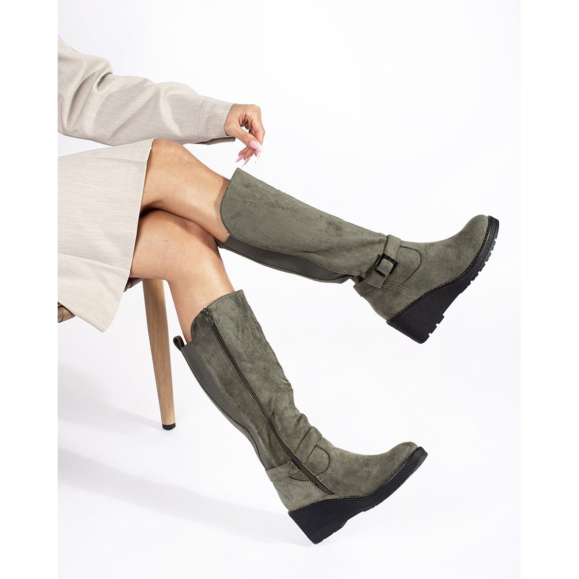 - Modell: Mörkgröna kilstövlar i mocka
