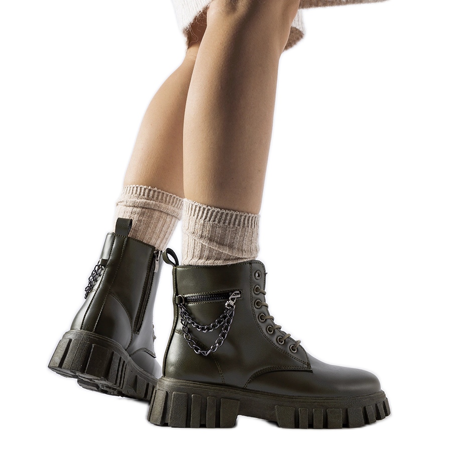Moderna och funktionella stövlar som kommer att ge karaktär till stadens look. Tillverkad av hållbart ekologiskt läder, på en resistent gummisula i samma nyans av grönt, kommer de att arbeta från höst till vår. Den runda näsan och fotleden som når upp den övre betonar den samtida, ungdomsstilen och den praktiska fickan och dekorativa kedjan ger en original accent. Låsning låter dig passa, medan låset på baksidan gör det lättare att infoga. Brist på uppvärmning gör dem idealiska för övergångssäsongen.