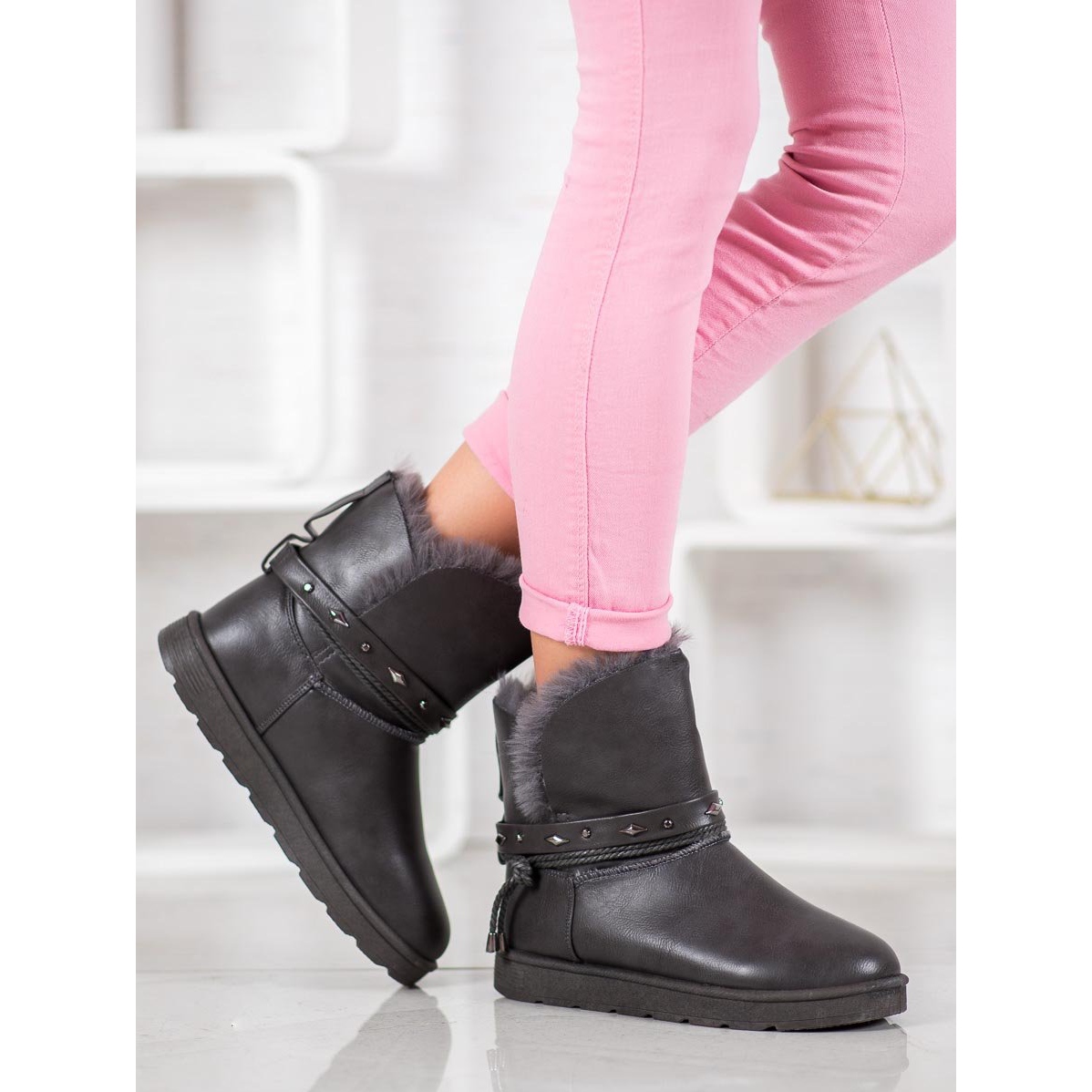 Ovandelen är gjord av ekologiskt läder av hög kvalitet och täckt med mjuk konstgjord päls, som effektivt skyddar mot kyla och fukt. Ytterligare dekorativa metallelement i form av strass och ett dekorativt bälte ger skorna originalitet och skiljer dem från andra modeller.