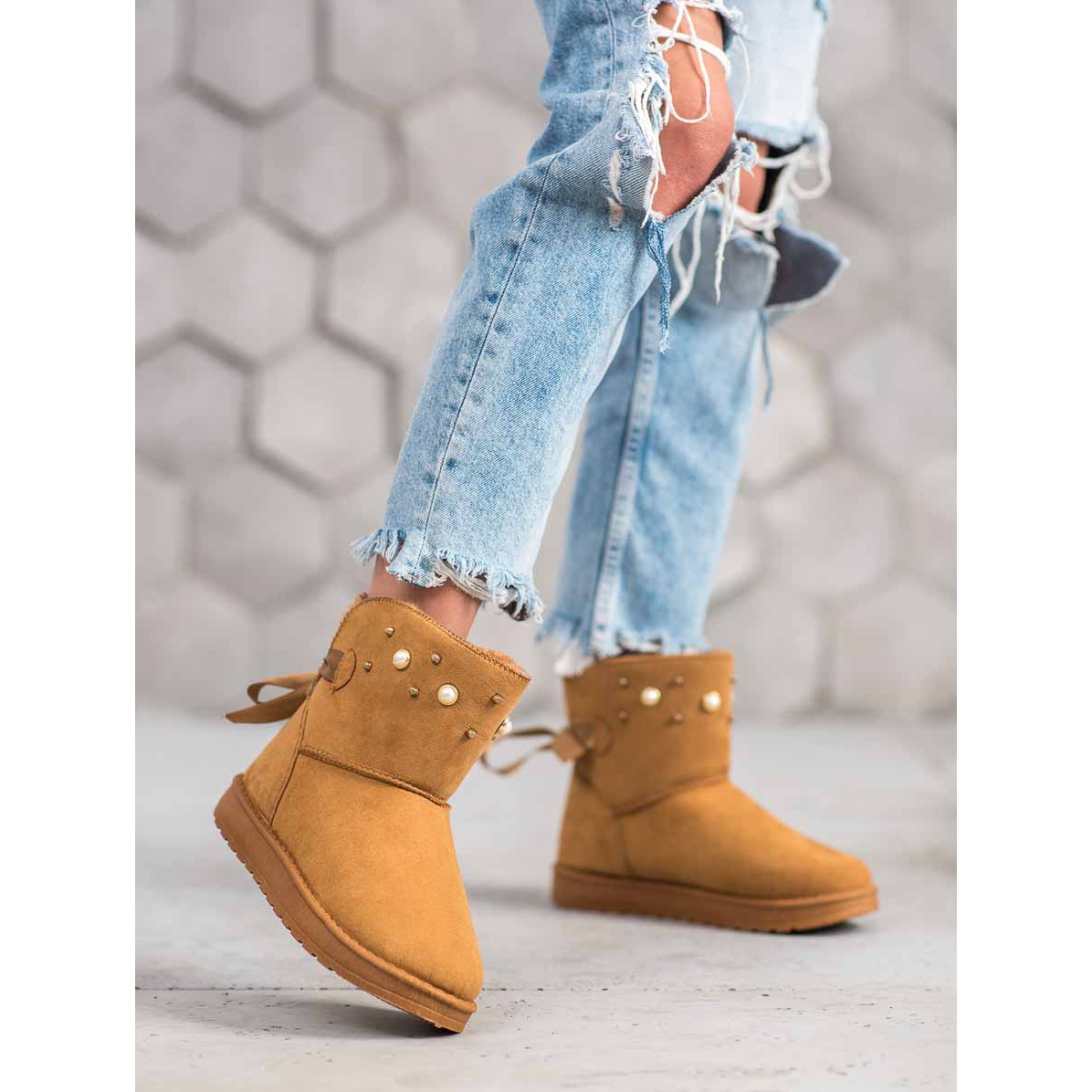 Den starka sulan på en 2,5 cm hög plattform ger utmärkt isolering från den kalla marken, vilket gör dem till en idealisk följeslagare för promenader eller vardagsutflykter. Mukluks har berikats med dekorativa detaljer, såsom runda jetstrålar och ett elegant bandband baktill på ovandelen. Tack vare dessa element får skorna en unik, moderiktig karaktär som väcker uppmärksamhet.