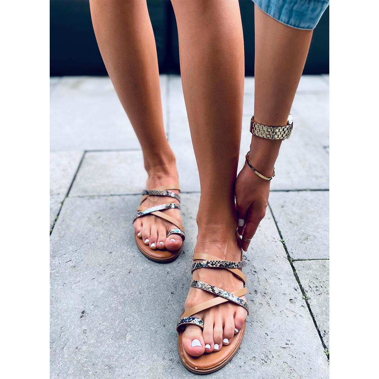 Nigella Beige flip-flops för kvinnor är det perfekta valet för kvinnor som vill kombinera komfort med moderiktig stil. Dessa flip-flops med platt sula har ett unikt ormskinnsmotiv som ger dem en unik karaktär och väcker uppmärksamhet. Tillverkade av högkvalitativt ekologiskt läder garanterar de komfort under alla förhållanden och blir ett perfekt komplement till vardagsstyling.