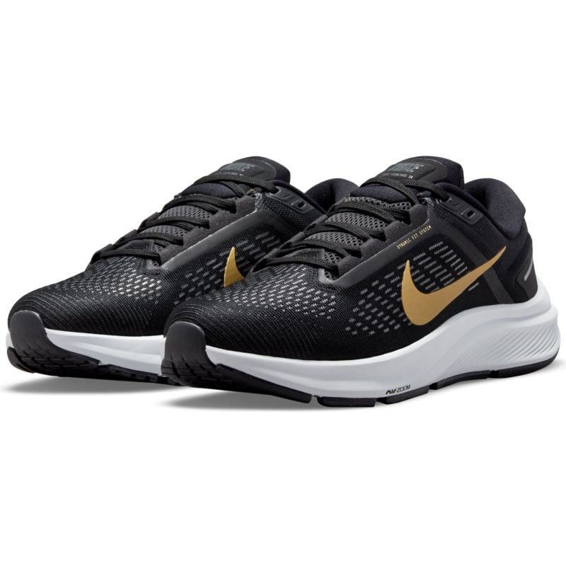 Tack vare den eleganta svarta färgen med vita och guldiga accenter kommer Nike Air Zoom Structure 24 inte bara att vara perfekt för rutten, utan kommer också att vara ett elegant tillskott till din sportgarderob.