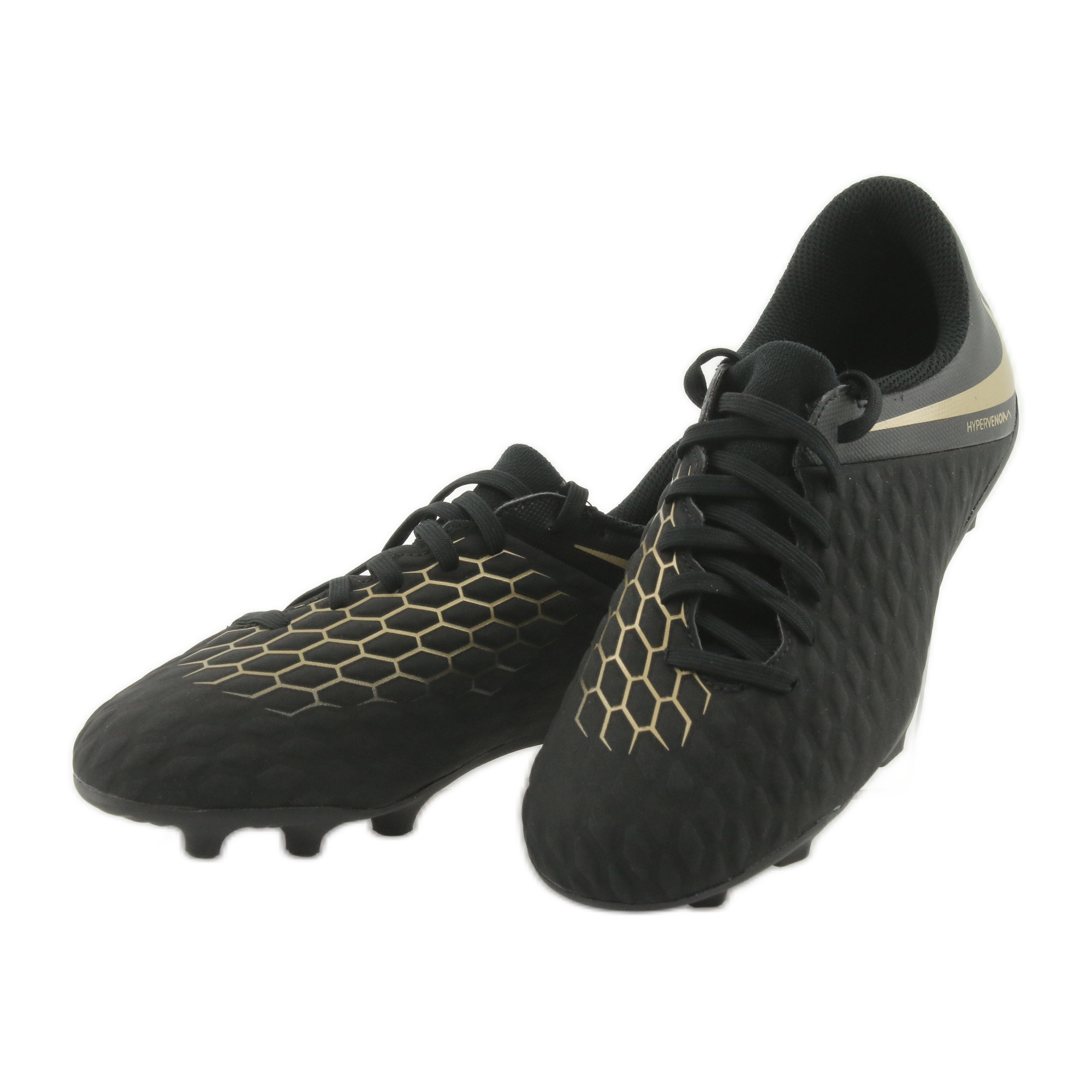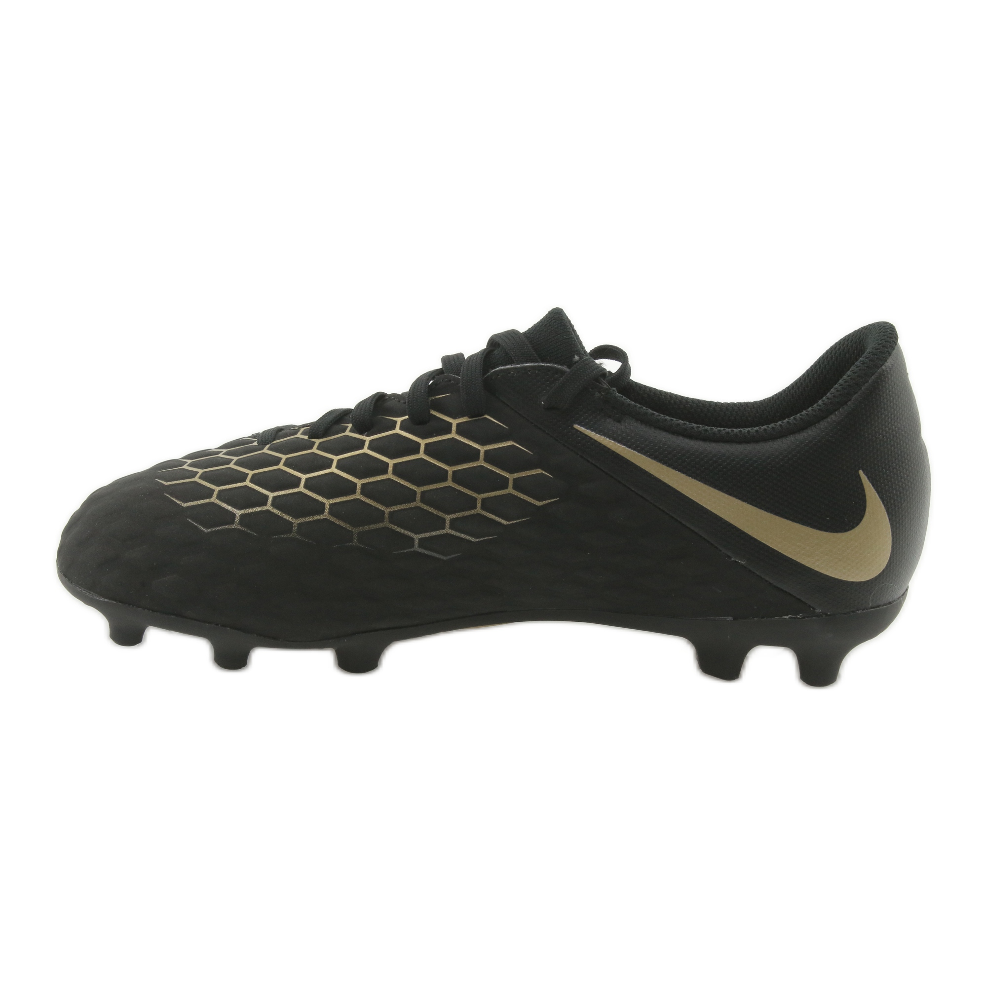 Nike Hypervenom Phantom 3 Club FG Jr kännetecknas av en modern och attraktiv design, som är en del av den exklusiva Game of Gold-kollektionen. Modellen som annonseras av stora anfallare som Robert Lewandowski eller Harry Kane kommer säkerligen att ge barn mer självförtroende på planen. Skornas färger, i en elegant svart nyans med ytterligare guldaccenter, gör att de ser extremt snygga ut.