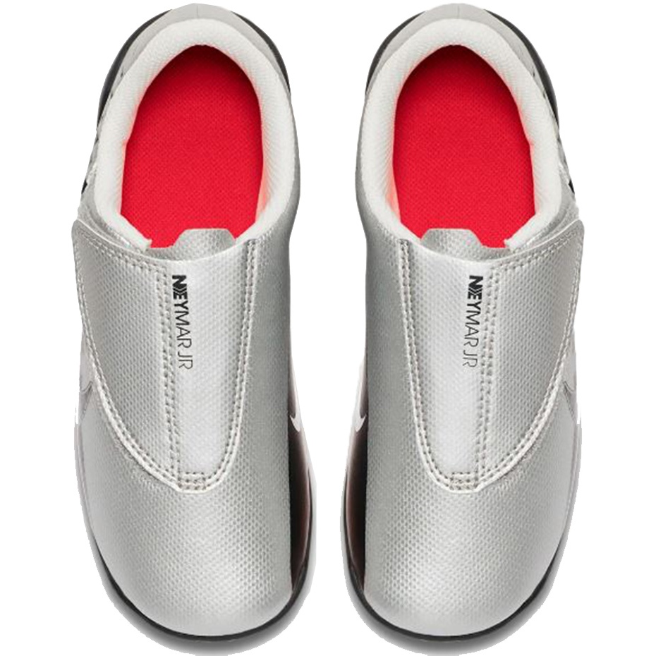 Ett lätt, rekreationsförslag från Nike för unga spelare inspirerade av Neymars stil och Speed Freak -kollektionen. Silveröverdelen med en kompakt, svart grafik som hänvisar till F1 -gallret ger ett dynamiskt utseende, och den syntetiska, strukturerade ytan förbättrar kontakten med bollen. Modellen är avsedd att spela på en naturlig och konstgjord tonhöjd (MG) - en stabil sula med plasttrafikstockningar säkerställer viss markhållning. Stor kardborrfäste gör det lättare att ta på sig och passa snabbt.