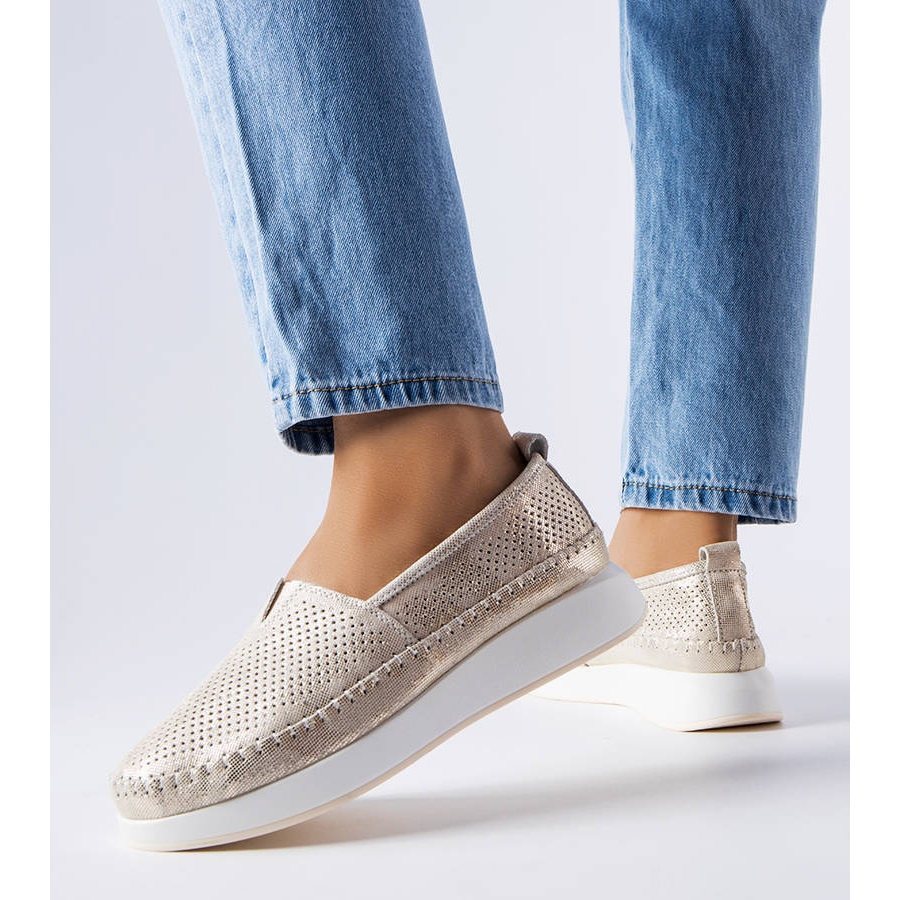 Eleganta och bekväma Noruega -skor i en spektakulär, gyllene nyans. Tillverkade av glansigt, naturligt öppet läder, kombinerar de elegans med en urban karaktär - idealisk för sommarstyliseringar när du vill betona stil och säkerställa komfort under dagen.