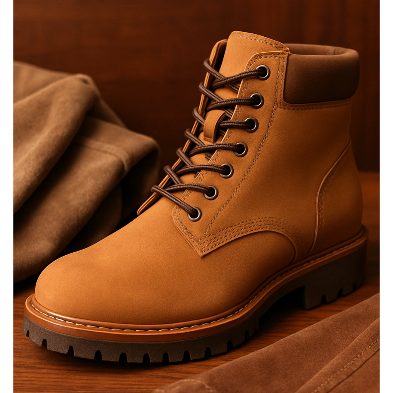 Arbetsstövlar i nubuck - en stilren utomhuslook. Kräver underhåll, men wow-effekt.