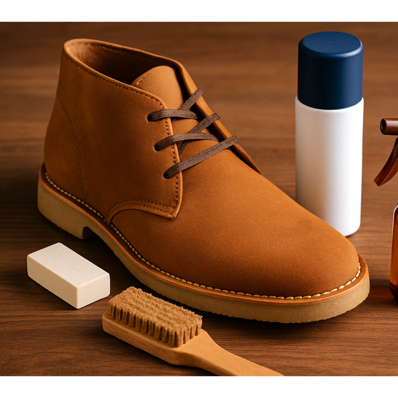 Nubuck/mocka suddgummi - skonsam gnuggning. Djupare fläckar: speciell nubuckrengöring + borste.