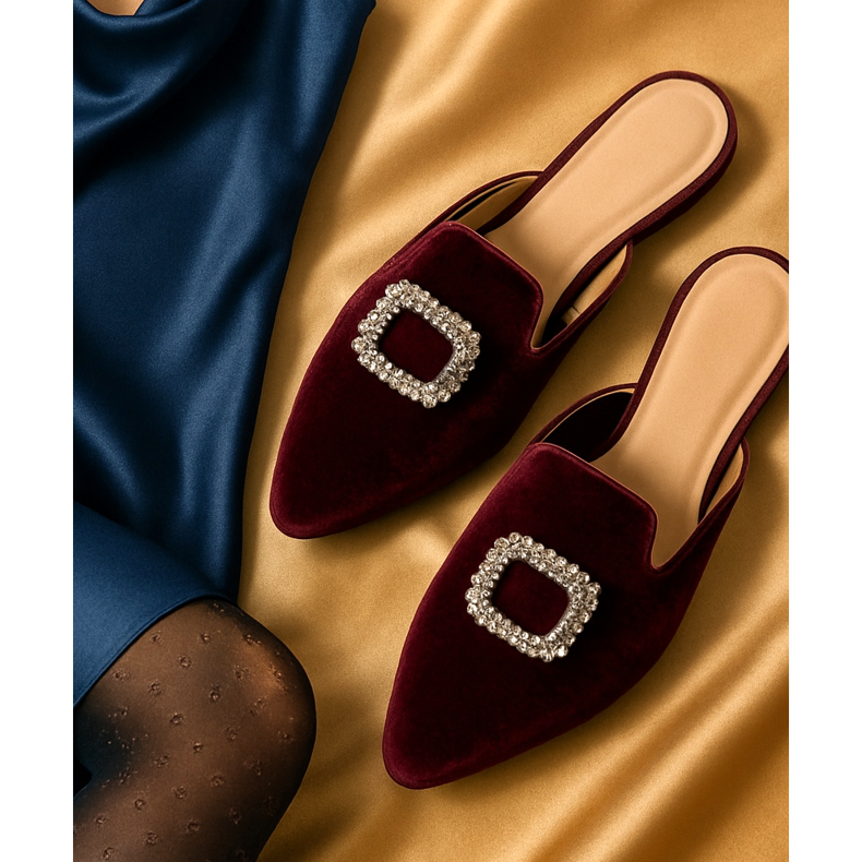 För de modiga erbjuder vi sammets- eller satinmulor med smyckesspänne. Även om de kan verka "hala", i kombination med en lång slipklänning skapar de ett extremt sofistikerat set. Kom bara ihåg att ta hand om dina strumpbyxor – i år är strumpbyxor med mönster eller glittertråd på modet, som även kommer att värma dina fötter en kall natt.