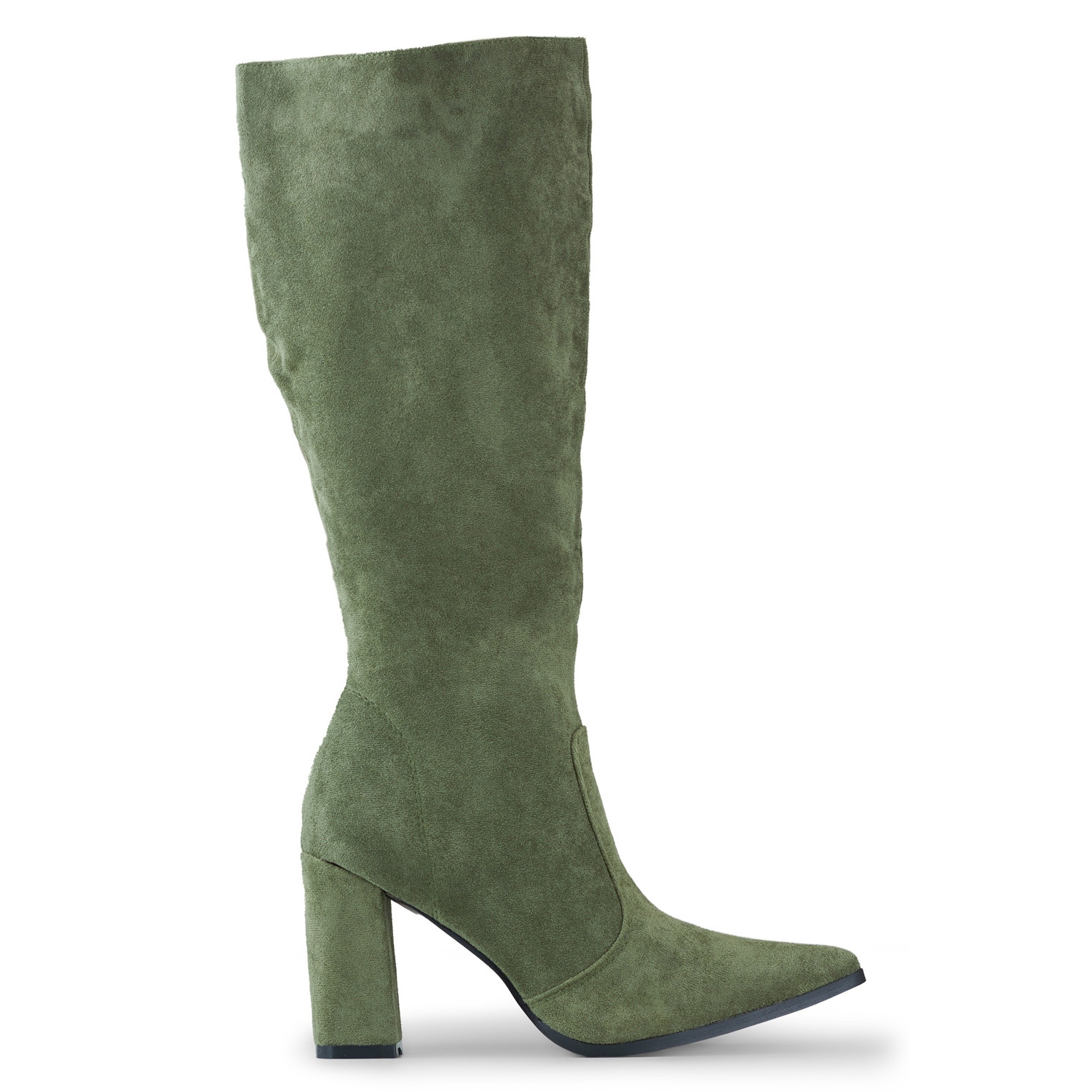 Klassiska kvinnors stövlar som når under knäet i en modern olivfärg. Tillverkad av ekologisk mocka, med en bekväm 9 cm bar och ett sidoslott - perfekt för hösten/vintersäsongen för älskare av tidlös stil.