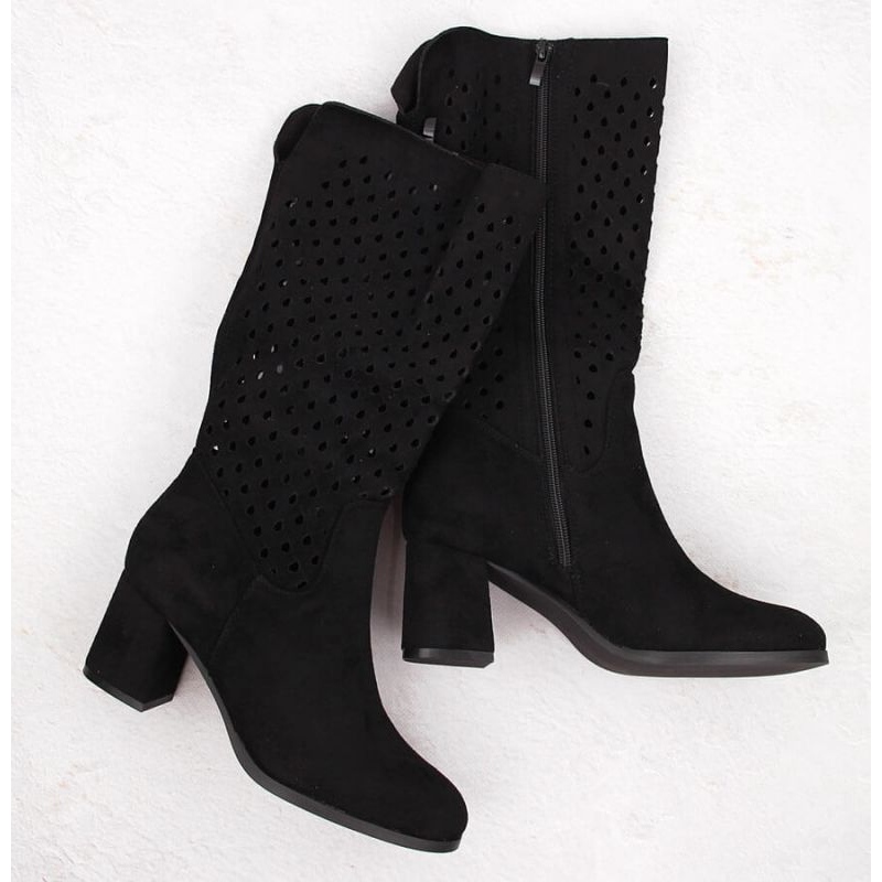 M. Daszyński Openwork -stövlar i SAN43A i svart är ett idealiskt förslag för kvinnor som värderar en kombination av modern design med att bära komfort. Tillverkade av högkvalitativ mocka ekologiskt läder ser dessa skor inte bara bra utan också säkerställer hållbarhet och komfort. Openwork Upper Decorations ger dem originalitet, vilket gör att de blir en unik accent av all stilisering.