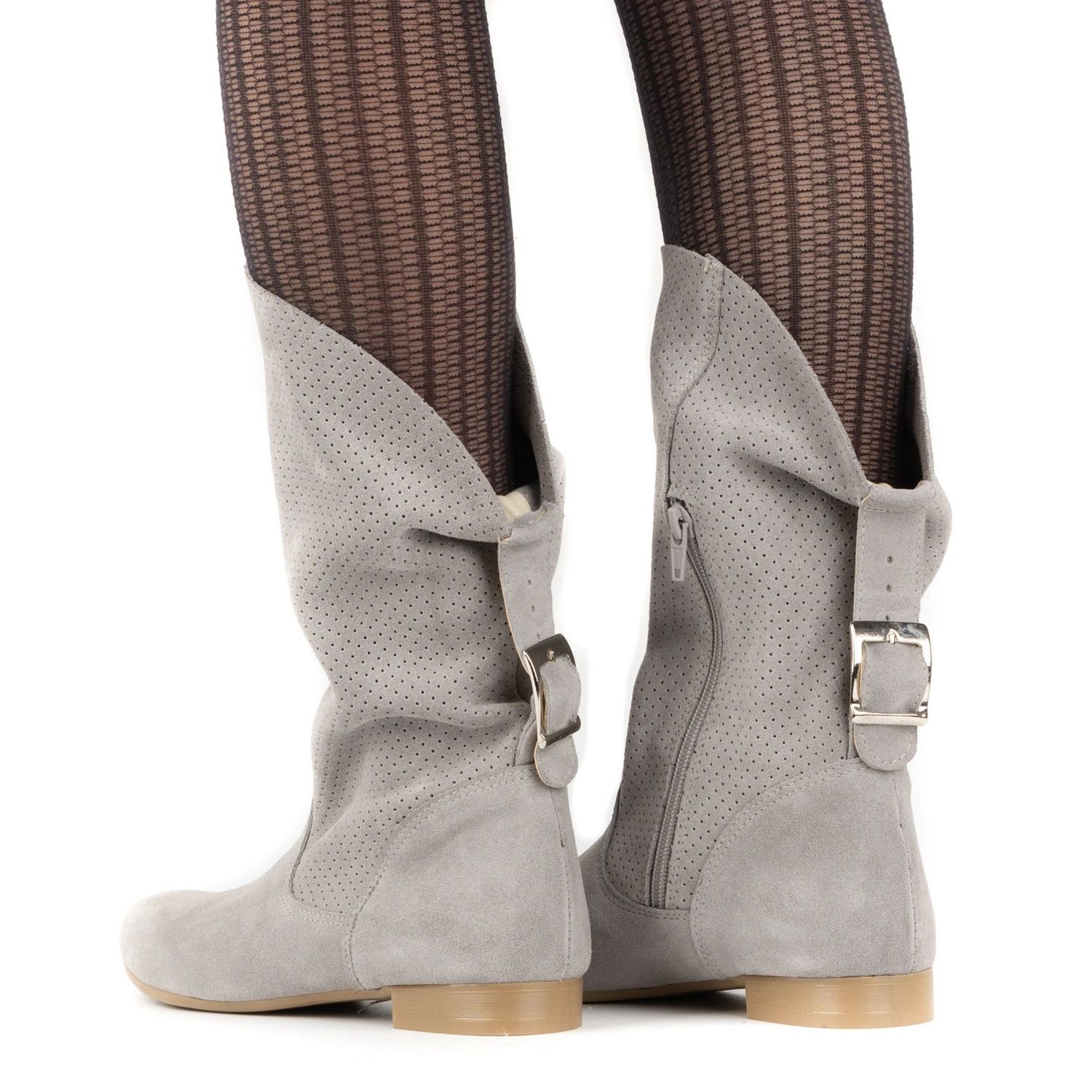 De skapades av naturligt nubuckläder, vilket garanterar hållbarhet och komfort. Skorna inre är fodrad med mjukt naturläder, som perfekt anpassar sig till fotens form, eliminerar risken för avtryck och ökar komforten att bära. Ett ytterligare element i form av ett spänne och ett lås gör att sätta och ta av dessa stövlar extremt enkelt.