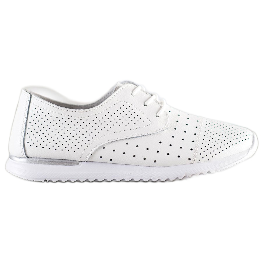 Upptäck unika Kylie-skor som kombinerar elegans och vardagskomfort. Dessa genombrutna, vita skor är helt gjorda av naturligt läder, vilket inte bara säkerställer ett snyggt utseende, utan också hållbarhet och andningsförmåga, perfekt för vår- och sommardagar.