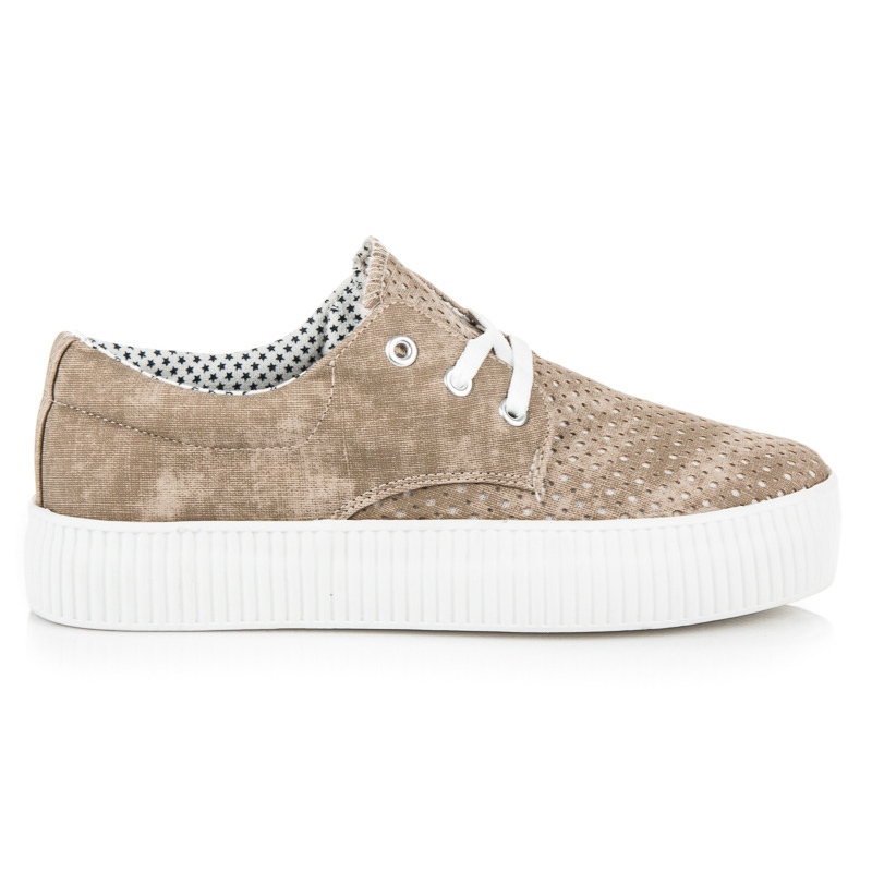 Den bruna färgen gör att dessa sneakers passar perfekt till många stilar, både vardagliga och sportiga. Den runda tån och den inbyggda, mjuka hälen säkerställer bekvämt att bära, och snörning ger en perfekt passform till foten. Plattformshöjden på 3,5 cm ger extra komfort och lätthet utan att belasta fötterna.