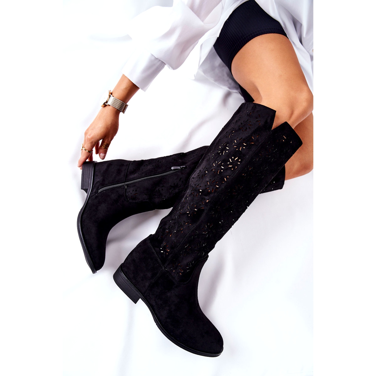 Stövlarna har en platt klack med en dold kil som subtilt framhäver figuren utan att ge avkall på komforten. Knäppt med dragkedja anpassar de sig lätt till fotens form, vilket säkerställer bekväm av- och påtagning. Den knähöga stöveln kommer att se vacker ut i kombination med både känsliga klänningar och fashionabla byxor, vilket skapar unika kombinationer.