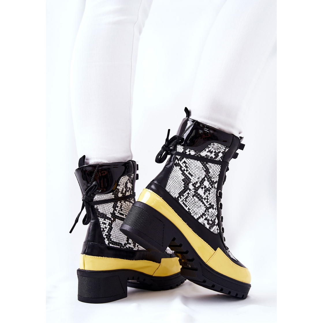 Upptäck de unika Meridiah Black and Yellow Snake Leather Boots, som kommer att bli en oumbärlig del av din garderob! Tillverkade av högkvalitativt eko-läder, dessa fashionabla stövlar sticker ut inte bara med sin unika design, utan också med noggrant raffinerade detaljer. Lackerat ekoläder på ovansidan av ovandelen och på sulan ger elegans och en unik karaktär.
