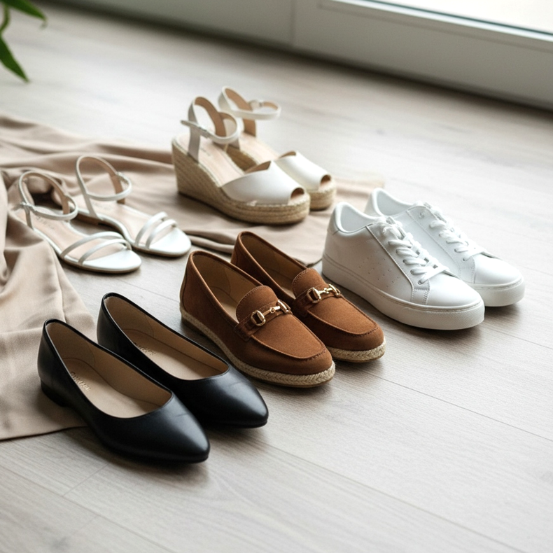 Bekväma men snygga skor bärs bäst med palazzobyxor varje dag. Om du föredrar komfort, välj balettlägenheter med spetsig tå eller mockasiner. Dessa klassiska modeller kommer perfekt att komplettera din vardagliga styling och få dig att se elegant ut utan att offra komfort.