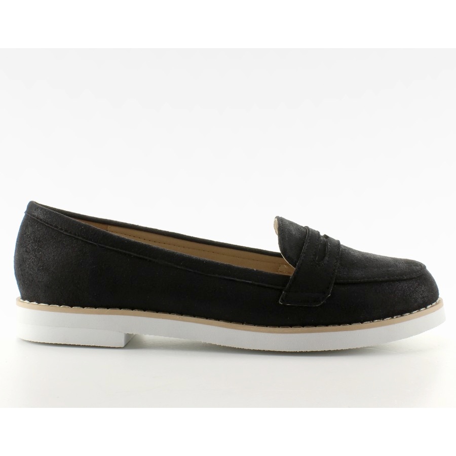 Pastellmockasiner för kvinnor 7112 Svart - svart med en subtil, skimrande glans, som kombinerar klassisk stil med en lätt, modern accent. Den välformade designen på en vit, sportig sula gör att skorna ser fräscha och snygga ut samtidigt som de är perfekta för vardagsbruk.