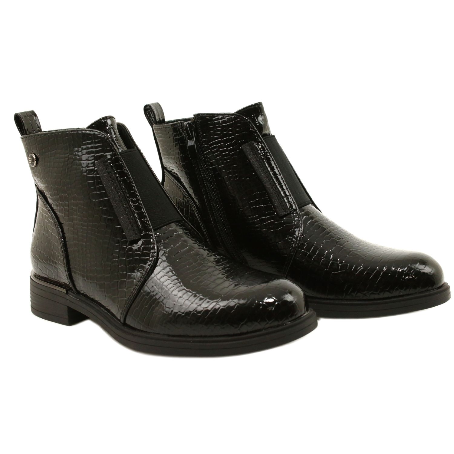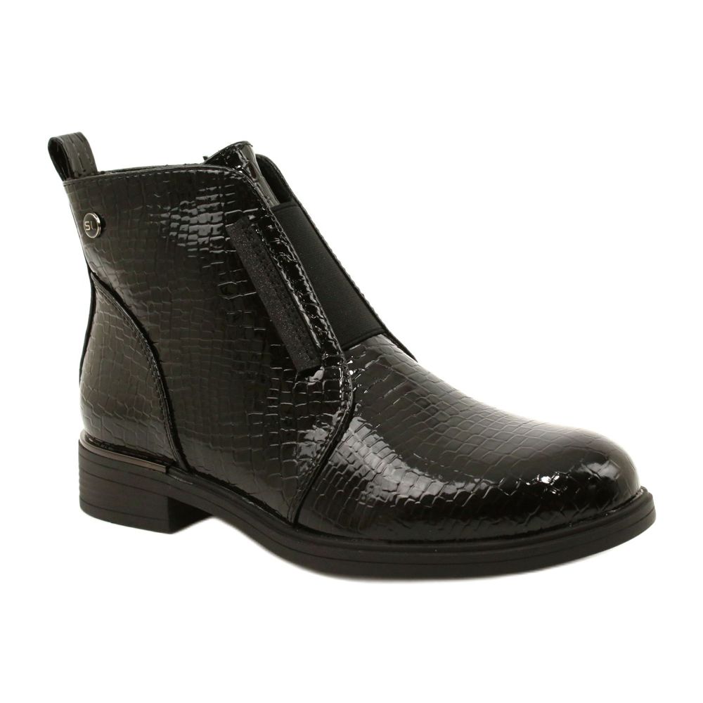 Chic Sergio Leone BT400 -stövlar är en kombination av kvinnors design och praktisk komfort. Tillverkad av lackerat ekologiskt läder i klassiskt svart, med ett subtilt djurmönster "skalor", kommer de att arbeta både i formella stiliseringar och i vardagliga uppsättningar. Deras universella karaktär gör att du enkelt kan matcha dem till en klänning, byxor eller kjol.