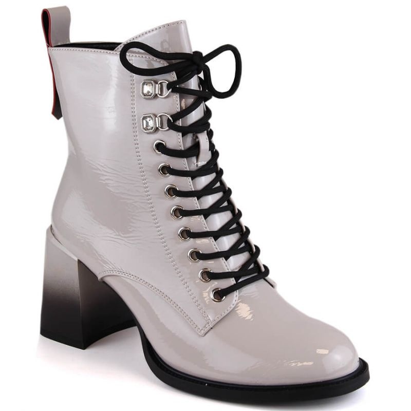 Eleganta och praktiska stövlar som kombinerar kvinnors elegans med komfort varje dag. Den lackerade ekologiska läderöverdelen ger dem en snygg karaktär, och det isolerade fodret "filt" ger komfort på svalare dagar. En stabil 8 cm häl betonar figuren, och fästning på en dragkedja och snören möjliggör perfekt passform.