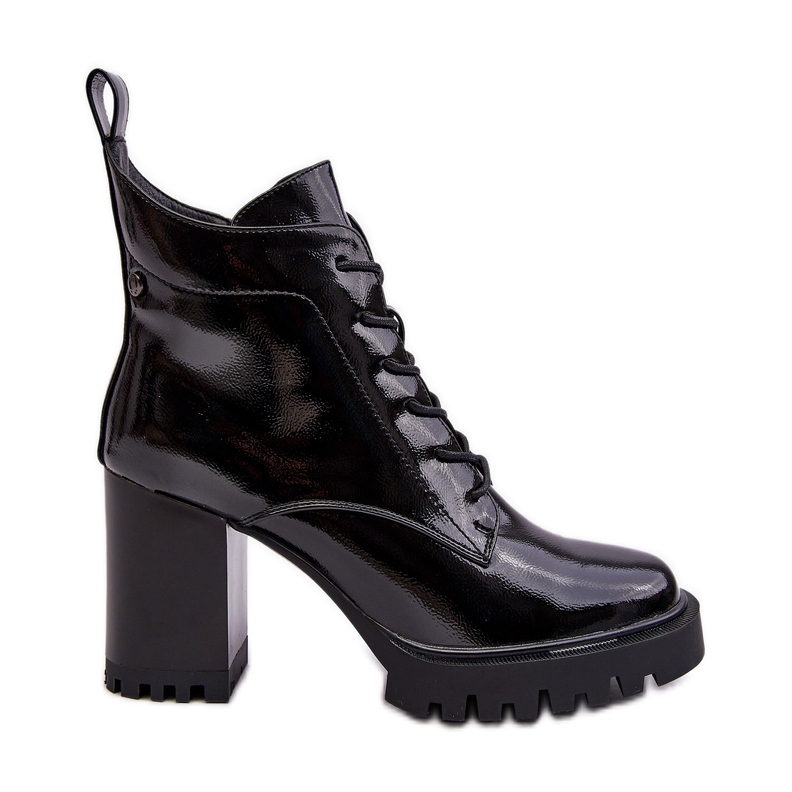 S. Barski vakade stövlar på pelaren isolerade - svart, eleganta och praktiska skor för hösten/vintersäsongen. Tillverkad av lackerat ekologiskt läder, beläget på en stabil stångklack (8,5 cm), säkerställer ett visst steg och ett feminint utseende. Interiören är fodrad med en uppvärmningsfilt tack vare vilken skorna kommer att fungera på svalare dagar.