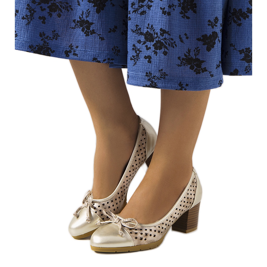 Upptäck elegans och komfort i ett - gyllene genombrutna Pereira-pumpar! Denna unika modell kombinerar modern design och funktionalitet, vilket gör den till ett idealiskt val för många tillfällen. Tillverkade av högkvalitativt ekologiskt läder i en blek guldfärg, dessa pumps kommer säkerligen att dra till sig uppmärksamhet.