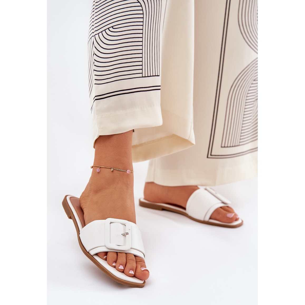 Information: Platt Eco Leather kvinnors tofflor med ett vitt spänne