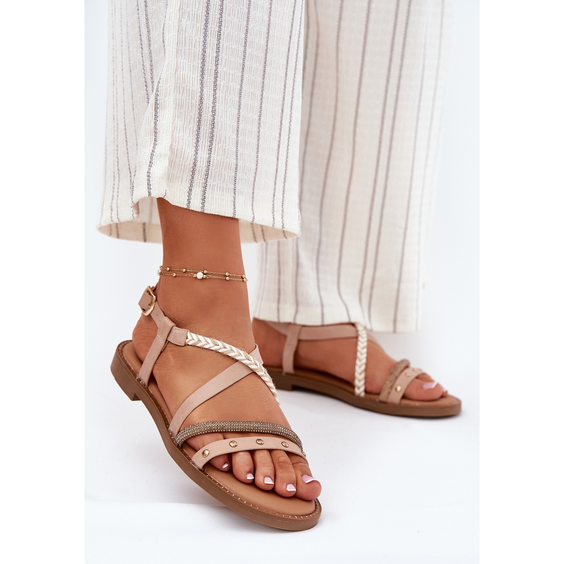 Detaljer: Platta sandaler med dekorativa Vinceza 17379 Beige Stripes